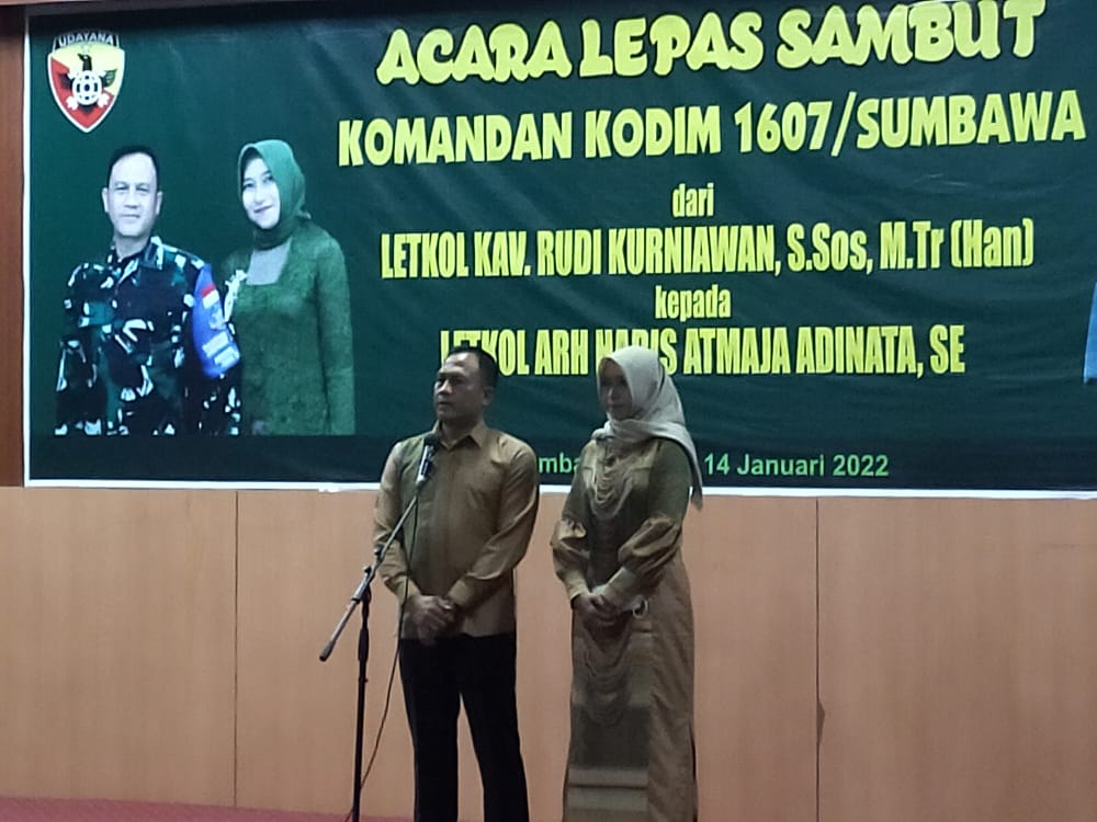 Sumbawa – Bertempat di Aula H. Madilaoe ADT Lantai III Kantor Bupati Sumbawa Jln. Garuda No. 01 Sumbawa Besar, Jumat (14/01/2022) malam, digelar acara Lepas Sambut Dandim 1607/Sumbawa dari Letkol Kav Rudi Kurniawan, S.Sos, M.Tr (Han) kepada Letkol Arh Haris Atmaja Adinata, S.E.