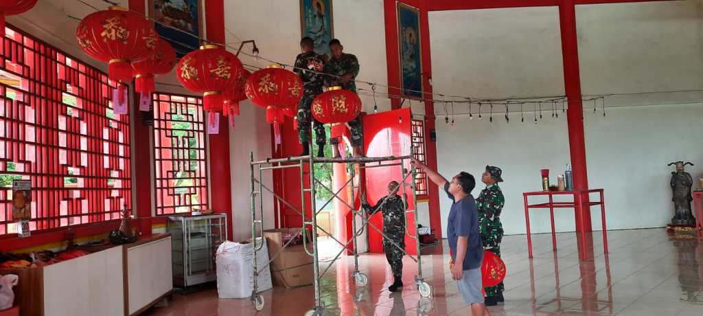 Anggota Kodim bersama warga saling bahu membahu membersihkan rumput rumput yang tumbuh liar di sekitaran Vihara. Selain pembersihan, anggota serta warga memasang Lampion di dalam Vihara.