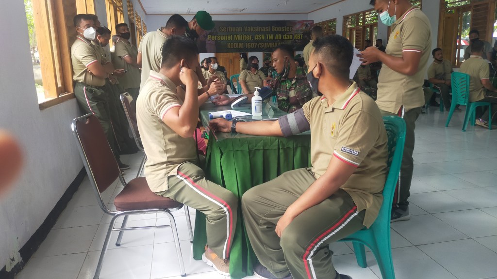 Sumbawa. Sebanyak 155 Personil Kodim 1607/Sumbawa melaksanakan vaksinasi Booster yang bertempat di Aula Makodim 1607/Sumbawa. Jumat, 04/02/2022.